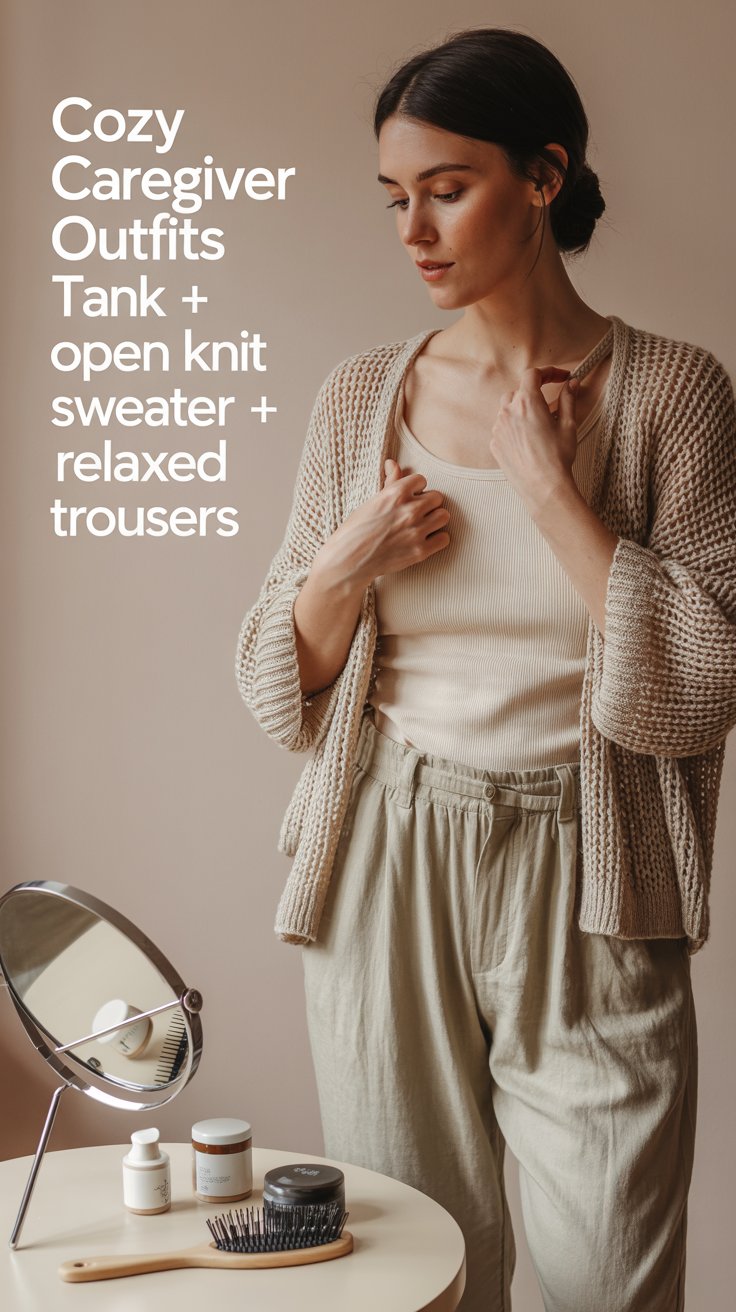 Layering helps caregivers adapt without outfit changes. A tank underneath allows you to remove layers as needed, while open knits prevent overheating. Relaxed trousers maintain comfort while still looking intentional.