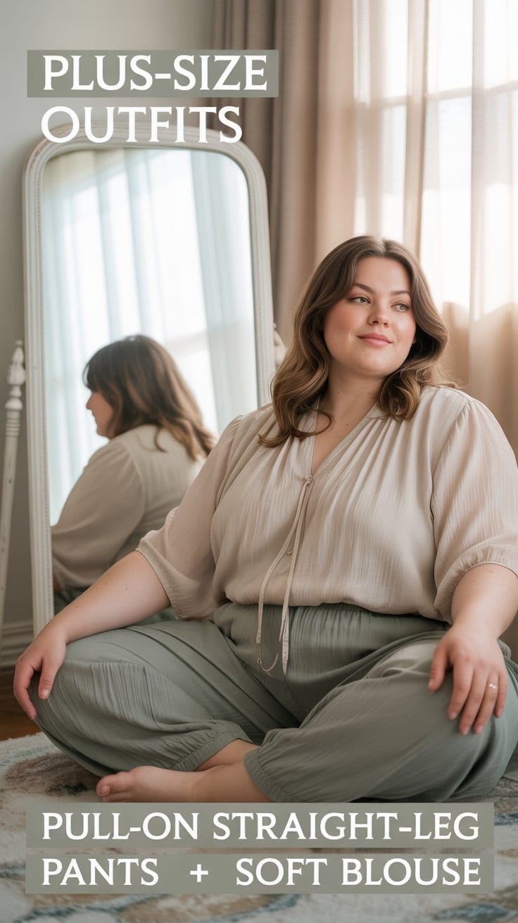 Straight-leg pants are one of the most reliable silhouettes in plus-size caregiver fashion.